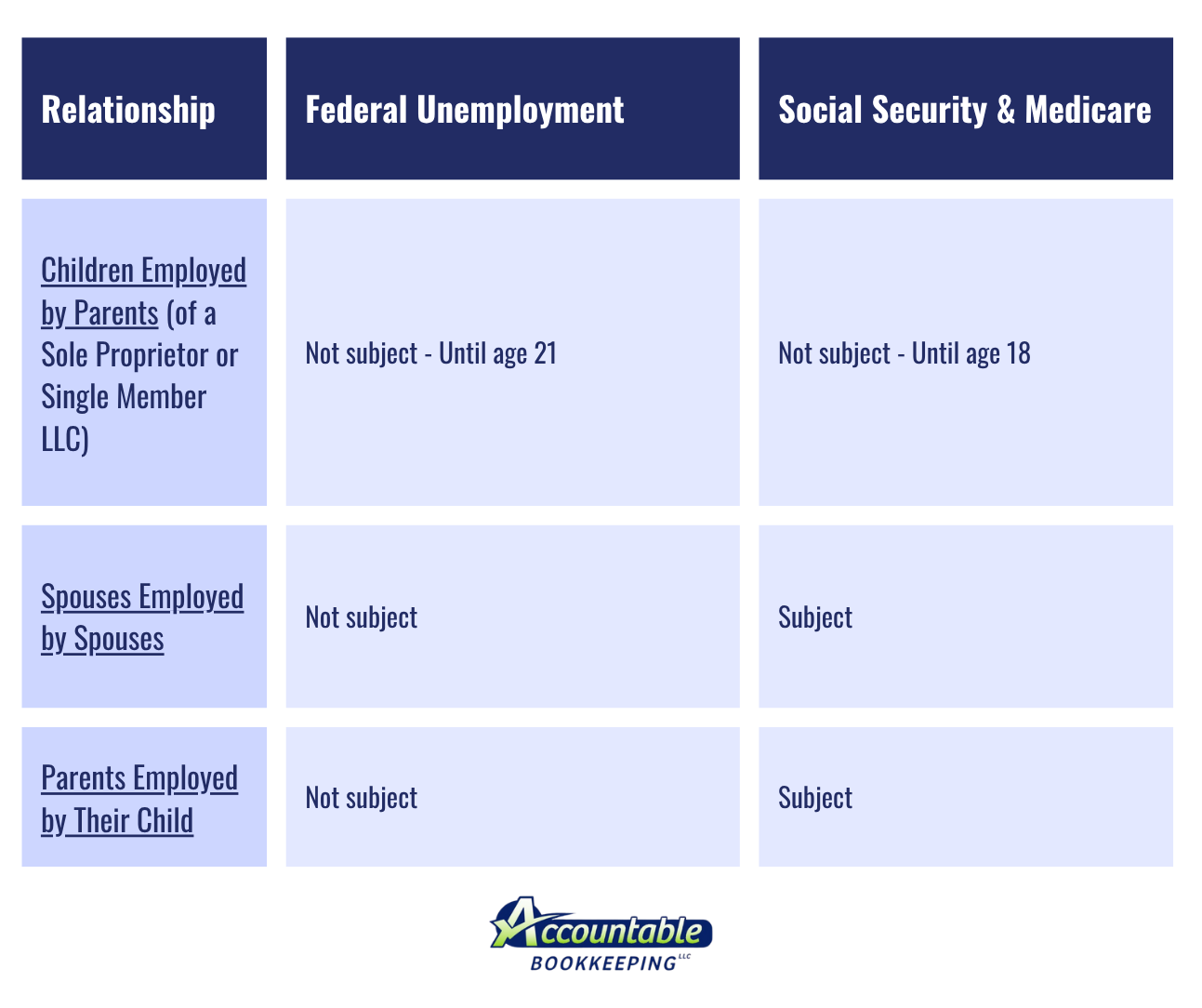 One of the advantages of operating your own business is hiring family members, however, employment tax requirements for family employees vary from those that apply to other employees. Take a look at the chart to decipher who's exampt from what!